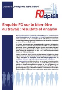 Dans le cadre de l’enquête « bien-être au travail » lancée en fin d’année dernière par les représentants FO du CHSCT, nous vous informons que les résultats et leur analyse ont été adressés, par courrier individuel, à l’ensemble des personnels du Département du Haut-Rhin.